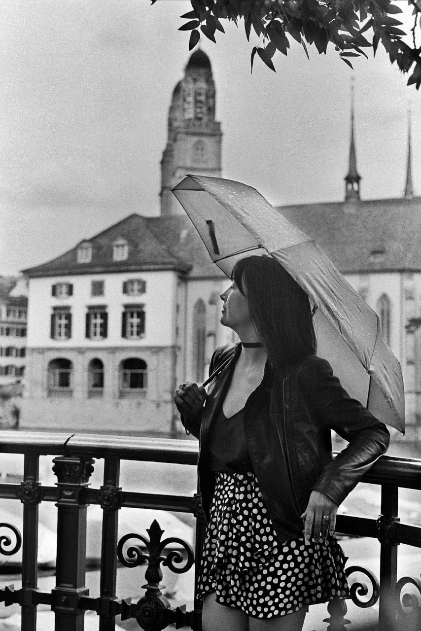 During the latest chapter of Forbidden Frames: 100 Years of Recreated Boudoir Photography History, Yuliya Panchenko stepped out from behind the lens and into the frame. Clad in a polka-dot skirt, armed with a Rolleiflex SL35, she wandered the damp, cinematic streets of Zurich. At her side: Marina Siahaan, boudoir ambassador, photographer, and a first-time film shooter, who took on the challenge of capturing Yuliya—using a mysterious, untested Pentax Asahi 35mm camera, freshly acquired during a prior episode in Madrid.